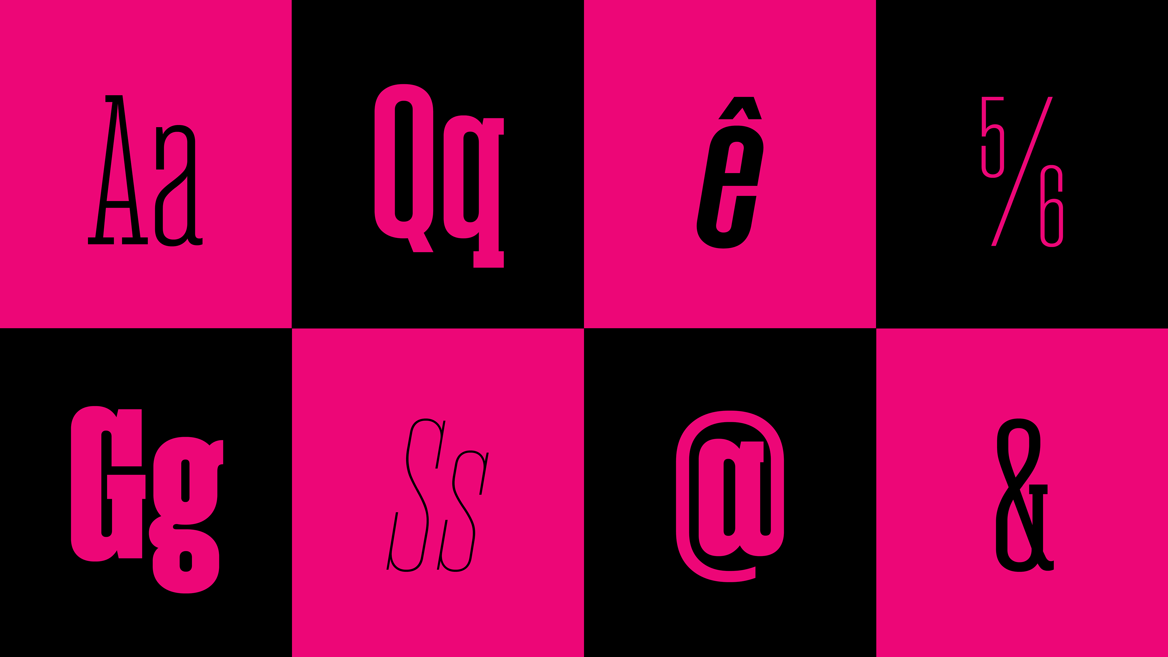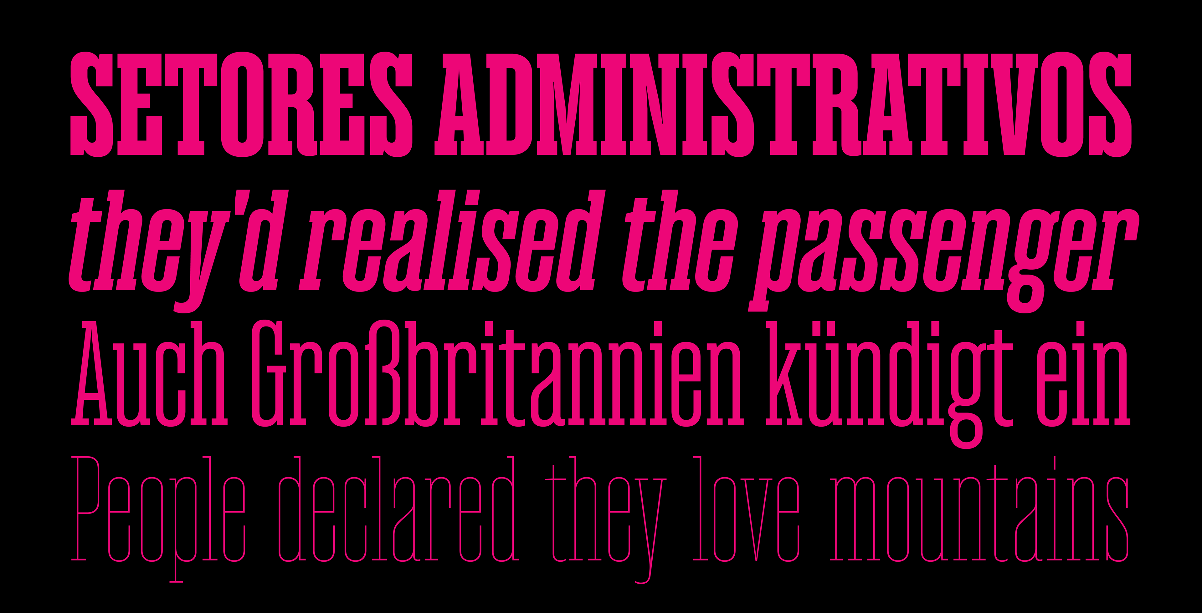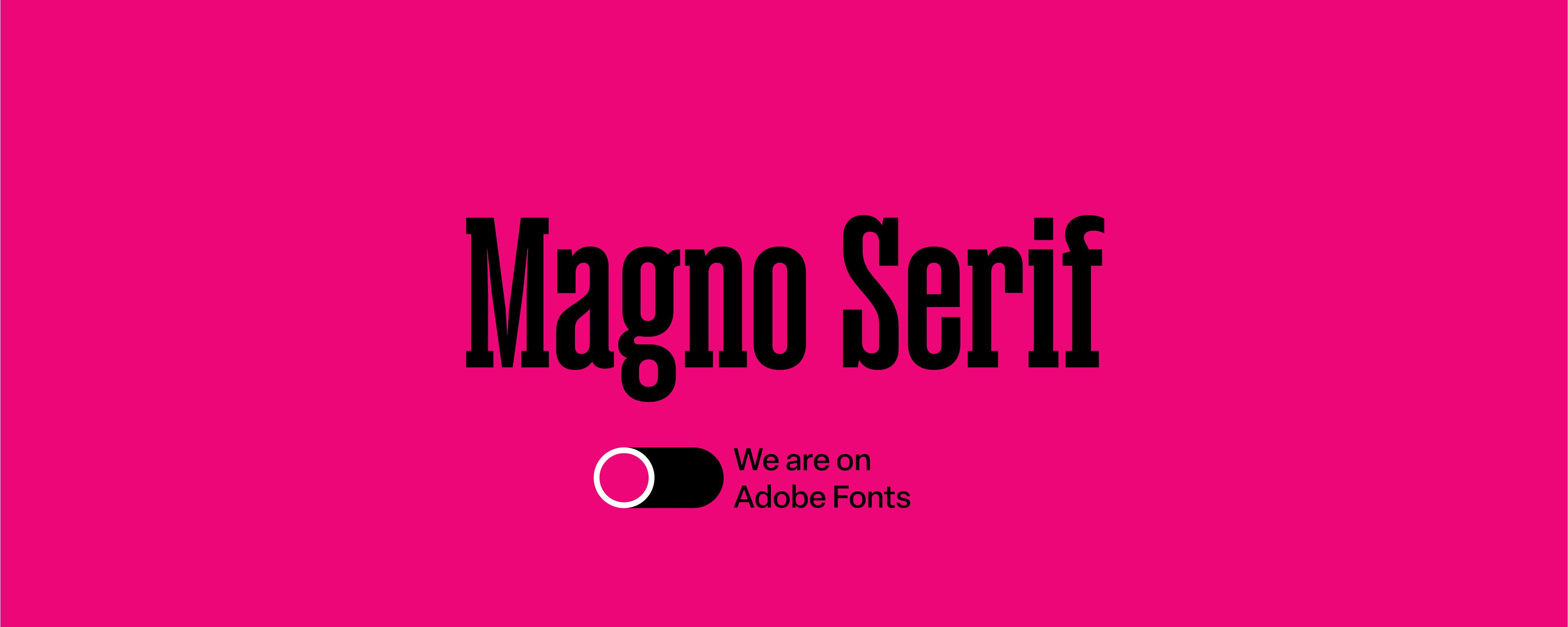 Magno began its life with a mysterious metal typeface as a reference: a "Memphis" found in Brazil that was never a real Memphis. Along the way, though, this condensed family became a whole new thing, far from a revival. It ended up with 8 weights for every version (serif and sans), plus obliques, a large latin character set covering over 200 languages, and a considerable amount of OpenType Features including sets of numbers, fractions, small caps, superiors and inferiors, arrows, quite a few alternates, and even a unicase stylistic set. It’s special care for the visual mass and consistency through the wide range of weights makes it a good display option for impactful messages.