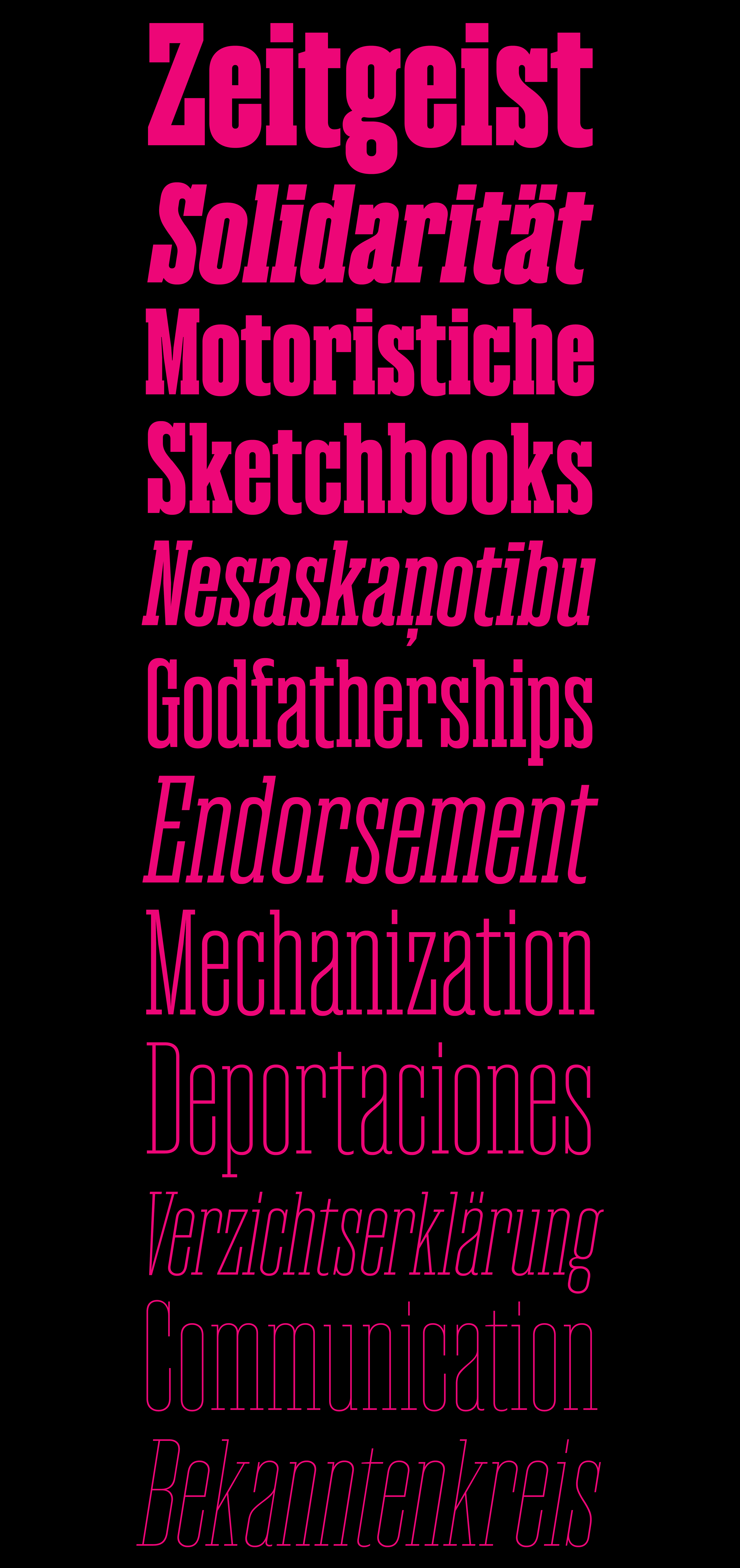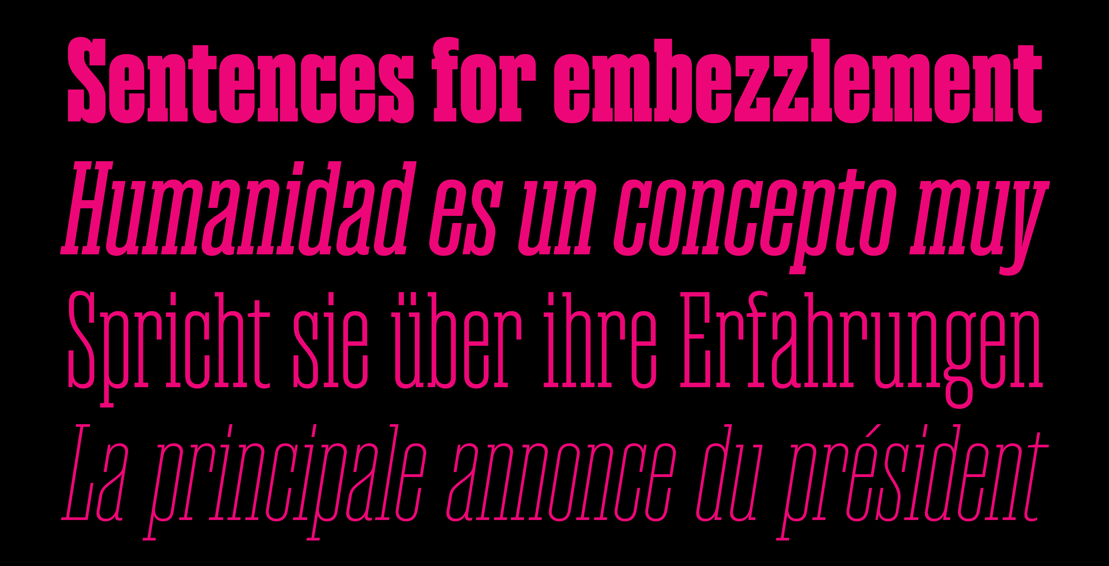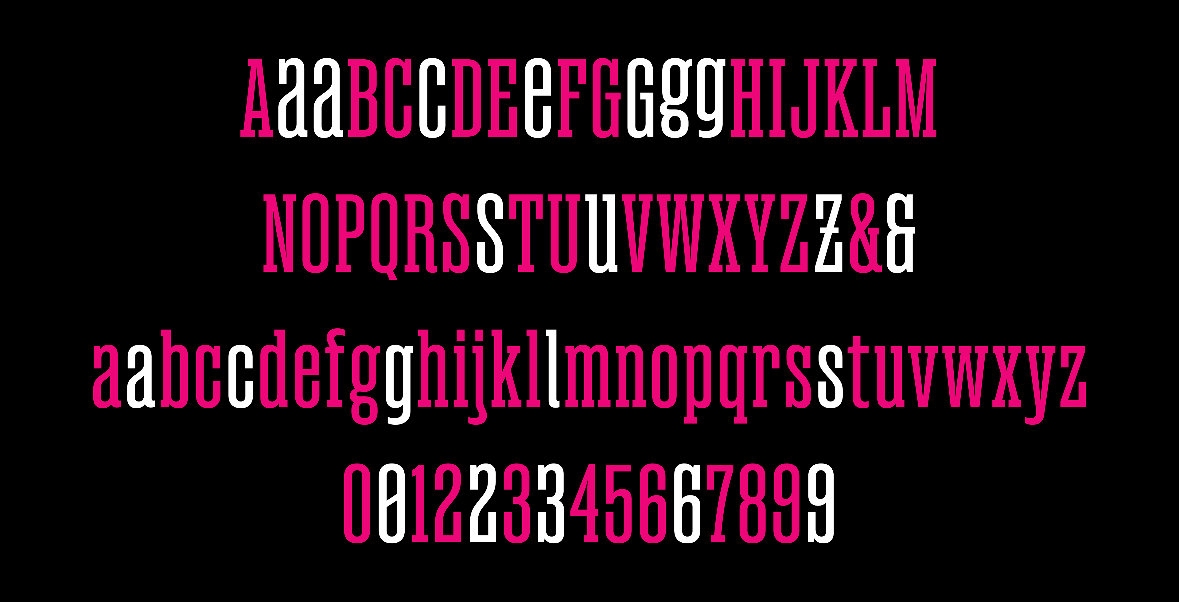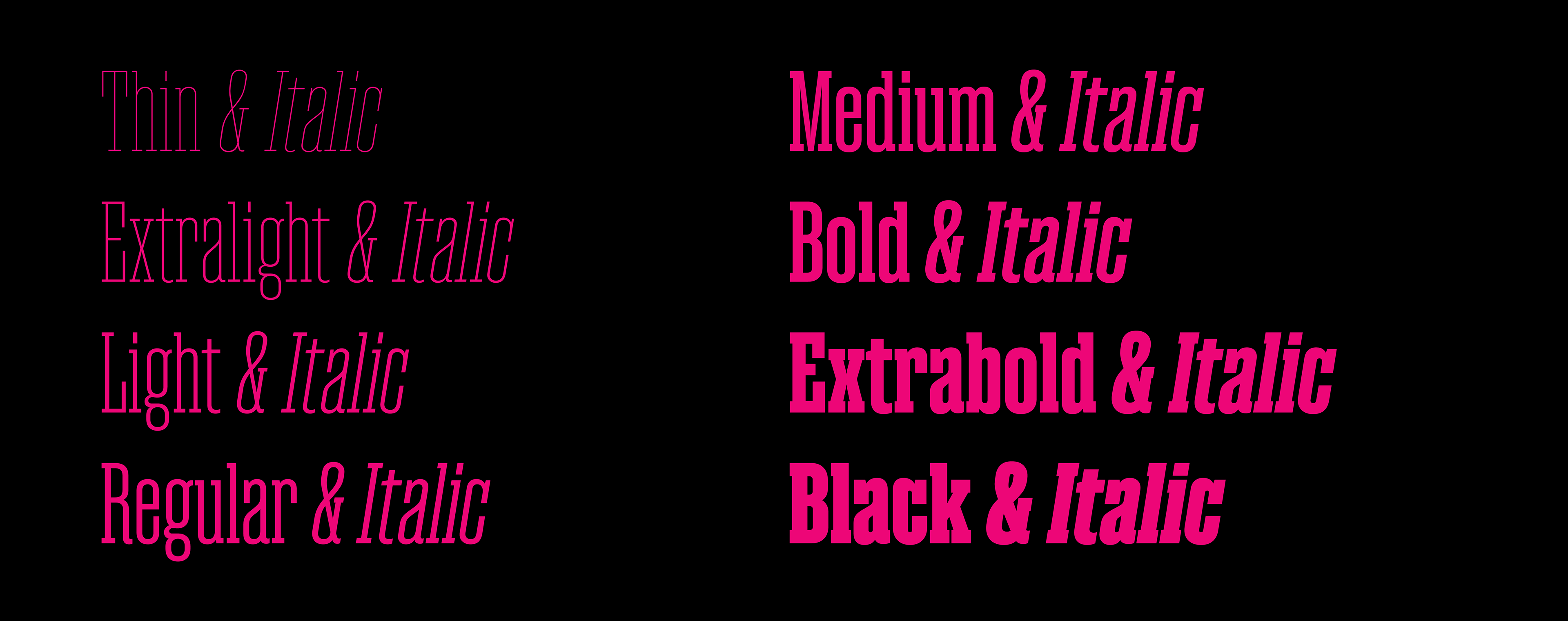 Magno began its life with a mysterious metal typeface as a reference: a "Memphis" found in Brazil that was never a real Memphis. Along the way, though, this condensed family became a whole new thing, far from a revival. It ended up with 8 weights for every version (serif and sans), plus obliques, a large latin character set covering over 200 languages, and a considerable amount of OpenType Features including sets of numbers, fractions, small caps, superiors and inferiors, arrows, quite a few alternates, and even a unicase stylistic set. It’s special care for the visual mass and consistency through the wide range of weights makes it a good display option for impactful messages.